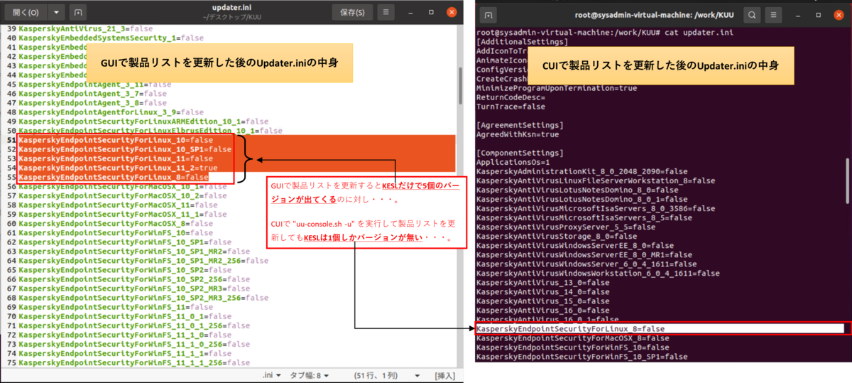 で。以下の画面は同じUbuntu 20.04.3 Desktop で、KUUのCUIから製品リストを更新した場合と、KUUのGUIから製品リストを更新した場合のUpdate.iniの中身です。