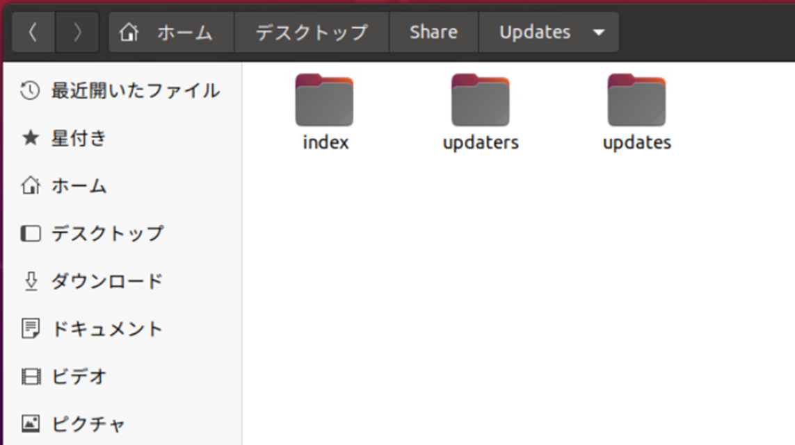 完了したら、[アップデート保管用フォルダー] で指定したディレクトリ配下に"updates" 等のディレクトリが作成されていることを確認します。
