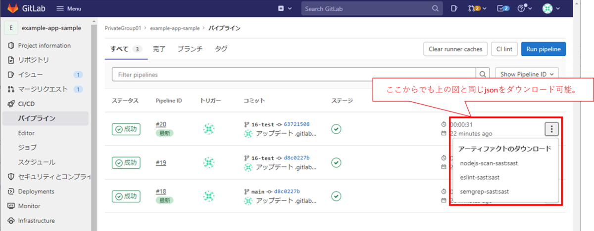また、エディション問わず、上のjson形式のファイルと同じものをCI/CDパイプライン履歴一覧からもダウンロードできます。