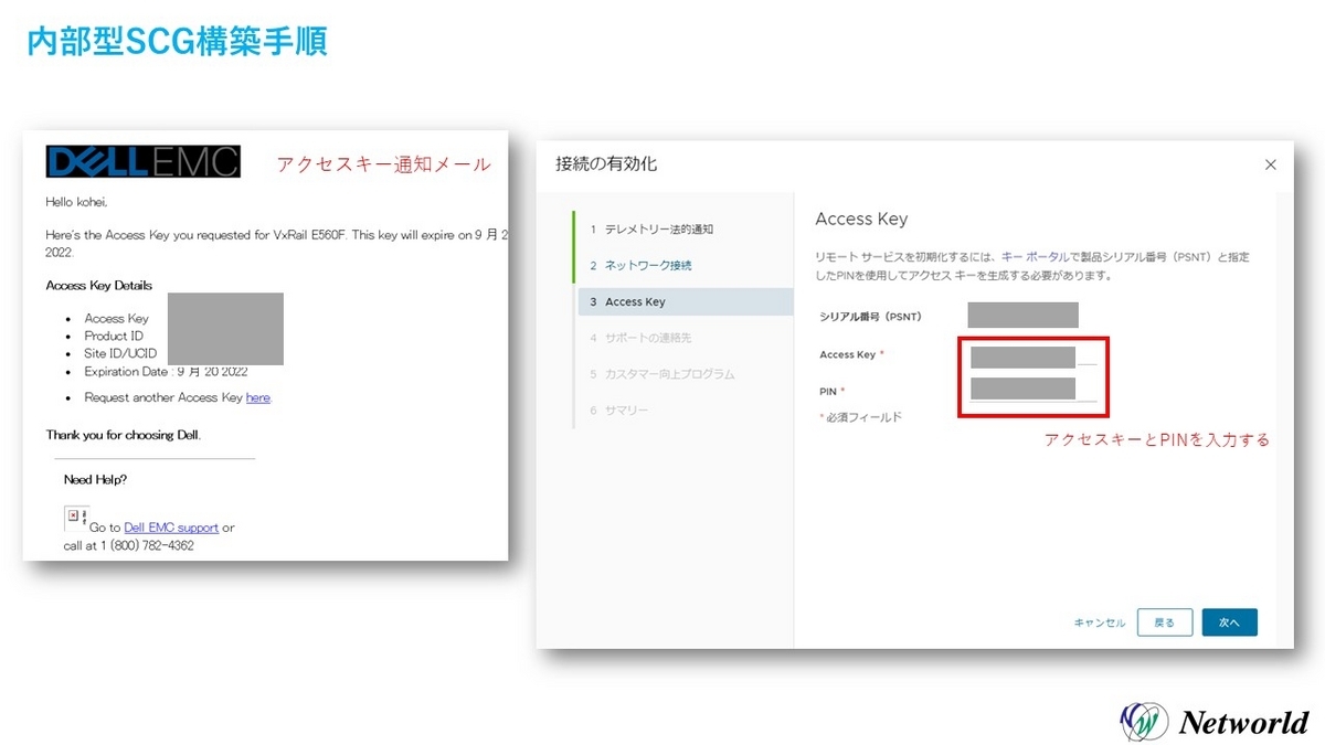 アクセスキーを生成後、Dell Technologiesアカウントに登録したアドレス宛にメールにてアクセスキーが通知されますので、ウイザードに戻り、アクセスキーとPINを入力し、「次へ」をクリックします。