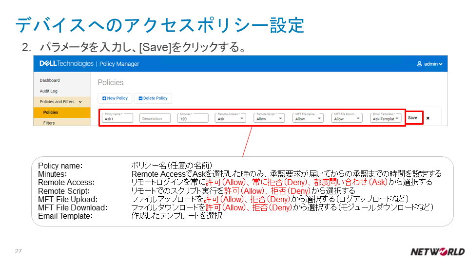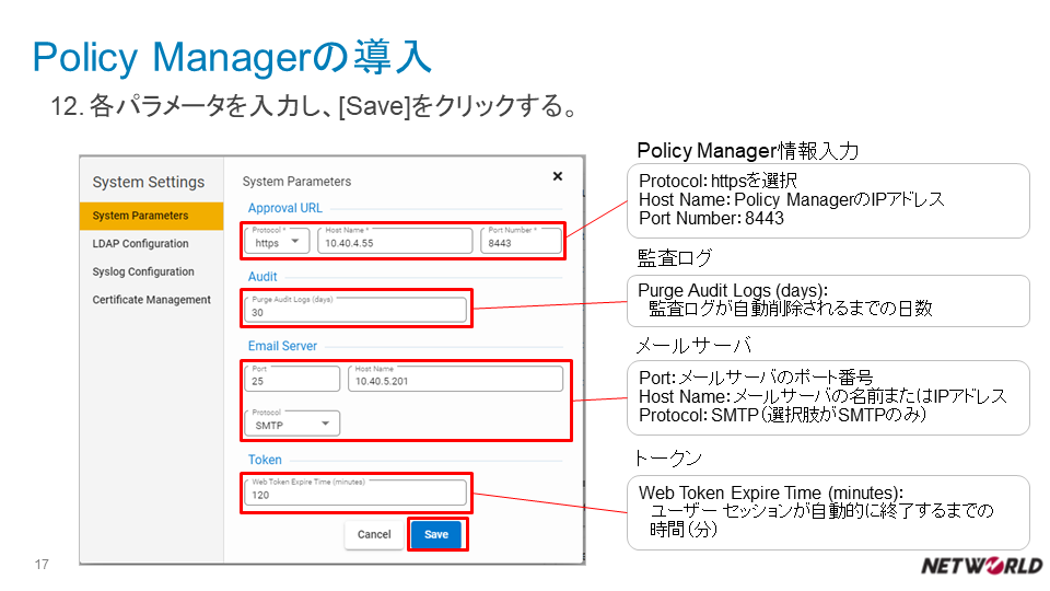 Policy Manager動作のために必要なパラメータを入力して[Save]をクリックします。