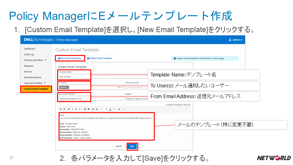Policy:Email Templateを指定して作成し、デバイスと紐づける