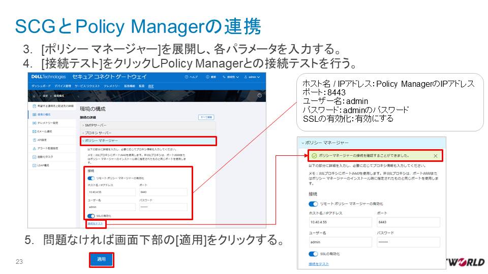 - 基本的にはSSLを選択していただきたいので、SCGからPolicy ManagerへのTCP 8443