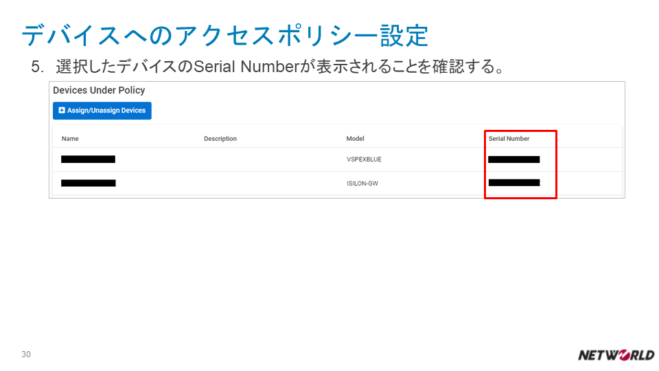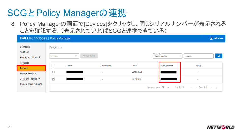 Policy Managerの画面に戻り、[Devices]をクリックし、同じシリアルナンバーが表示されることを確認します。
