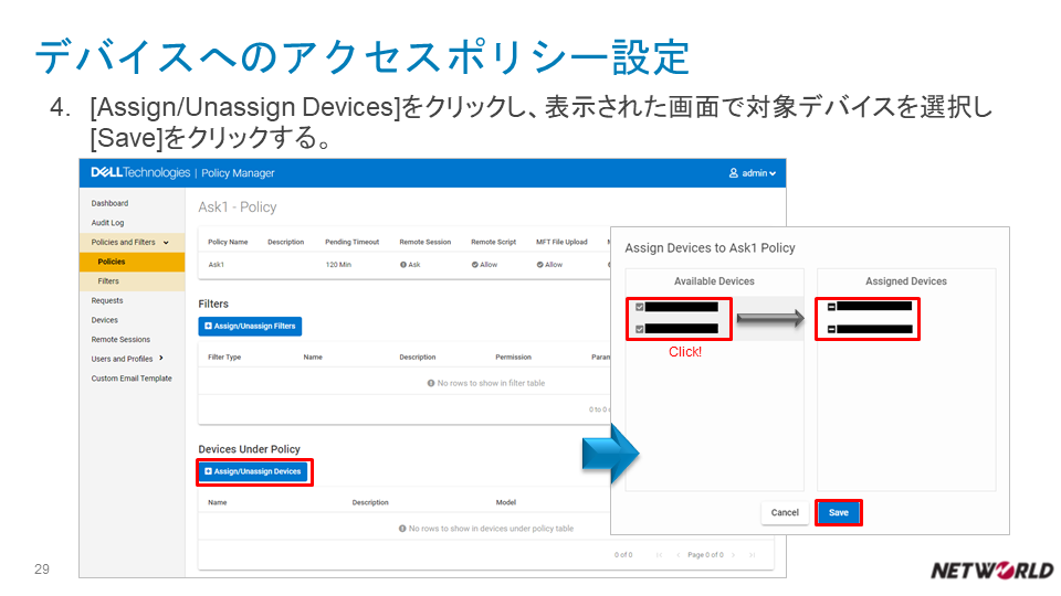 [Assign/Unassign Devices]をクリックし、表示された画面で対象デバイスを選択し[Save]をクリックします。