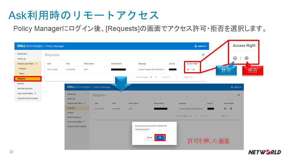 アクセス先でPolicy Managerにログインし、許可を選択 - メーカーサポートのリモートログイン成功
