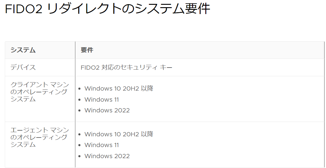 FIDO2 リダイレクトのシステム要件