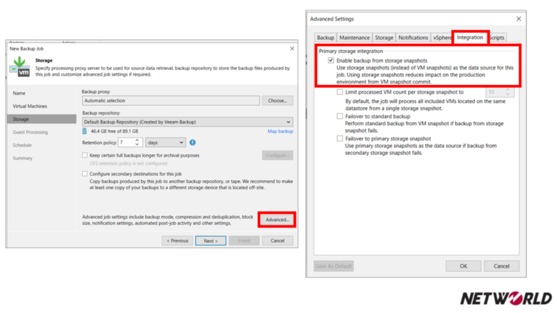 ポイントとしてはジョブ作成ウィザードの[Storage]の[Advanced...]から[Enable backup from storage snapshot]にチェックを入れる必要があります。