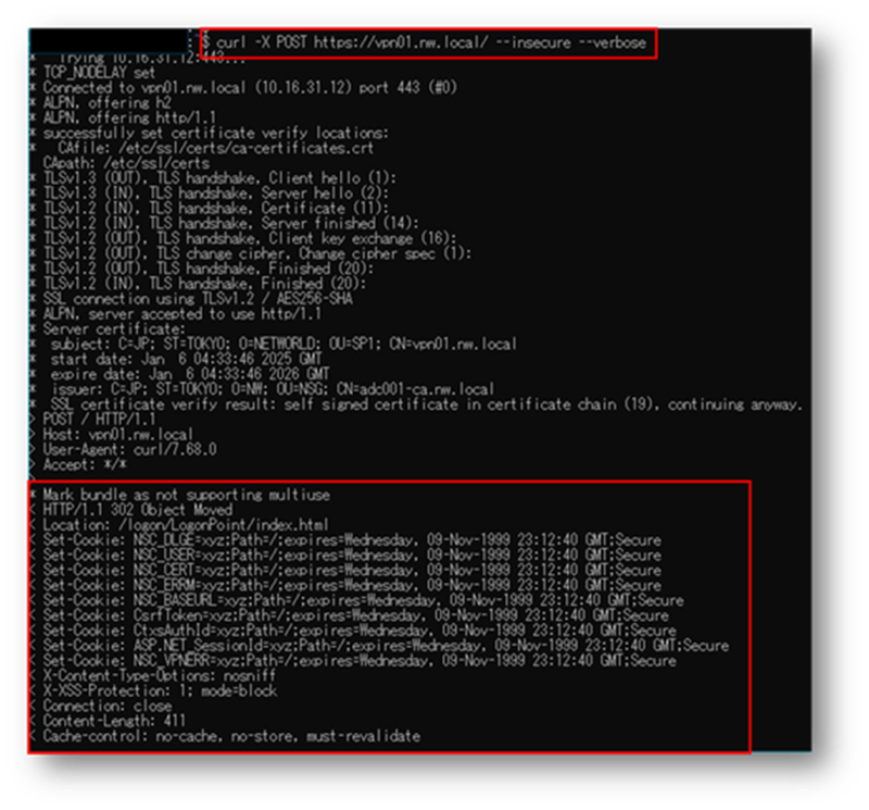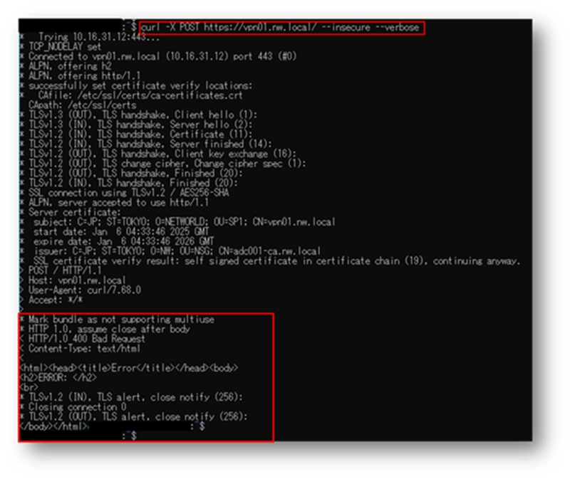 - WAF Protection 「VPN」適用時クライアントリクエスト、通信が正常に完了しない様子。curl を使って 「https://vpn01.nw.local/」 に対して HTTP POST メソッドを送信。