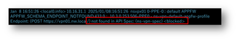 Jan 14 13:37:03 <local0.info> 10.16.31.1 2025/01/14:13:37:03 nsvpx01 0-PPE-0 : default APPFW APPFW_SCHEMA_OTHER 11122 0 : 10.16.33.100 30079-PPE0 - ns-vpn-default-appfw-profile Schema validation failed as per API Spec: (ns-vpn-spec) for Endpoint: (POST https://vpn01.nw.local/logon/LogonPoint/Resources/List) <blocked>