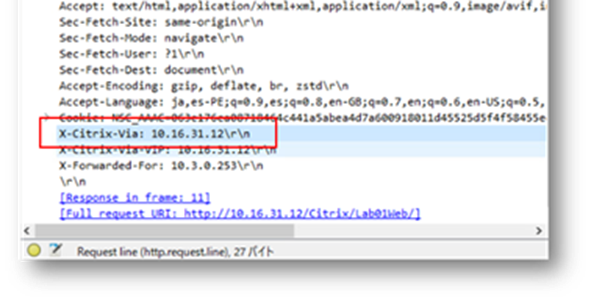 - NetScaler から StoreFront 宛ての HTTP リクエストのパケット情報、「X-Citrix-Via」が見られます。