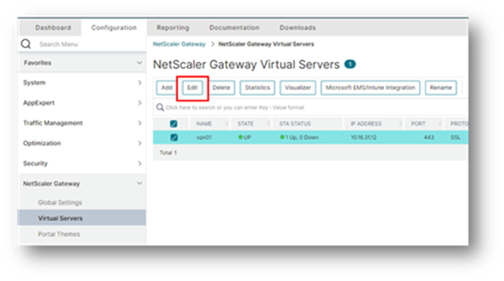 - 「NetScaler Gateway Virtual Servers」メニューに移動し VPN 仮想サーバーを選択 「Edit」します。
