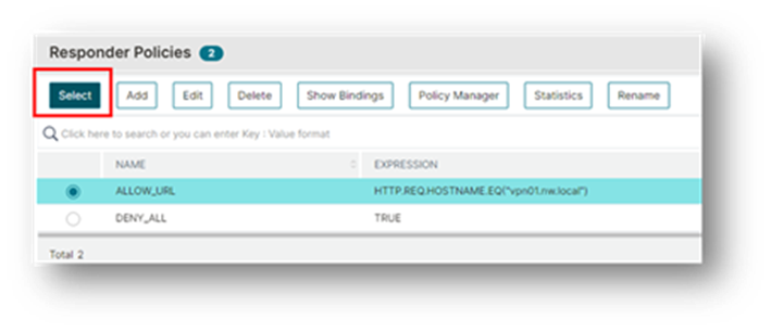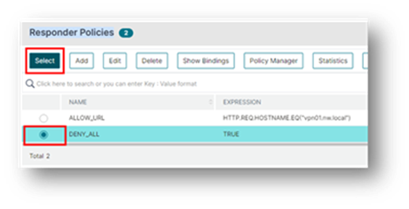 - 「Responder Policies」メニューから 「DENY_ALL」を選択の上 「Select」します。