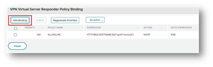 - VPN 仮想サーバーに Responder Policy を bind する。