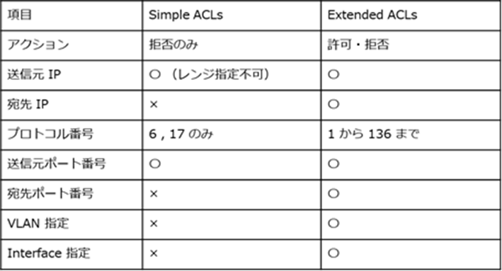 これらの通信をACL によって制御する場合は次のコマンドを使って設定します。