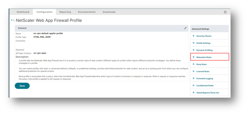 - 「NetScaler Web App Firewall Profile」メニューから 「Relaxation Rules」をクリックします。