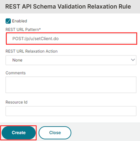- 「REST API Schema Validation Relaxation Rule」メニューの「REST URL Pattern」緩和対象のURL を入力し「Create」します。