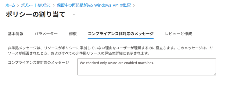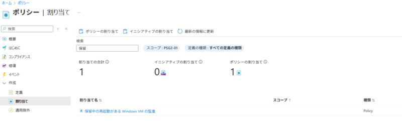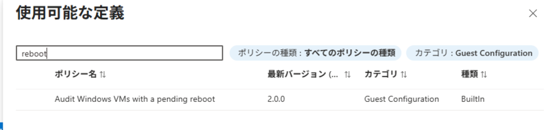 今回は、Azure arcで管理しているマシンのみに「保留中の再起動があるWIndowsVMの監査」というポリシーを割り当ててみようと思います。