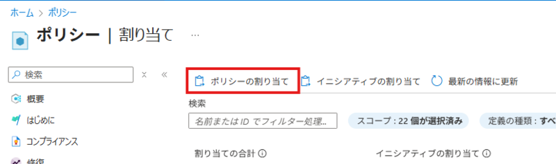 「ホーム」から「ポリシー」を開き、「割り当て」を確認します。