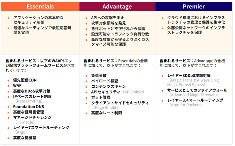 Externaパッケージは、パブリックに公開されるお客様のリソース(Webサイト、API、アプリケーション、ネットワーク)を保護するソリューションパッケージとなっています。WAFやCDN、DDoS攻撃対策、レート制限などの機能が含まれています。